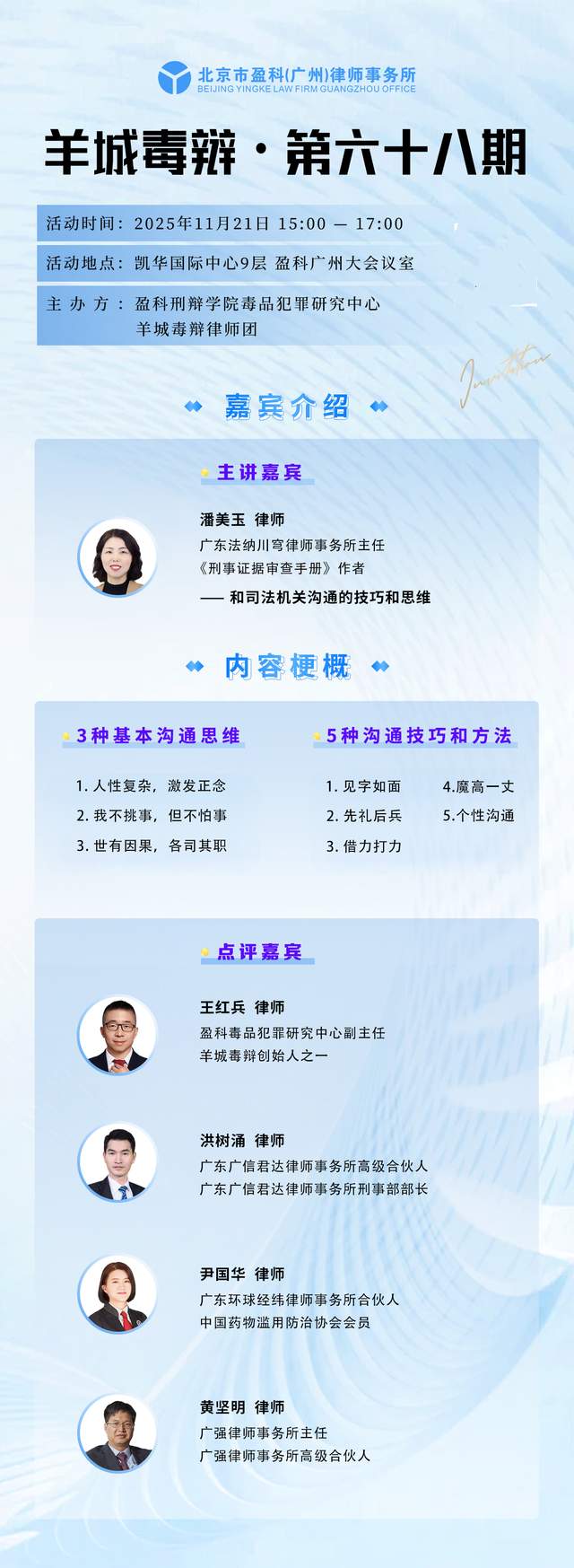 2025年11月21日,羊城毒辩与盈科刑辩学院毒品犯罪研究中心联合举办《和司法机关沟通的技巧和思维》分享活动。